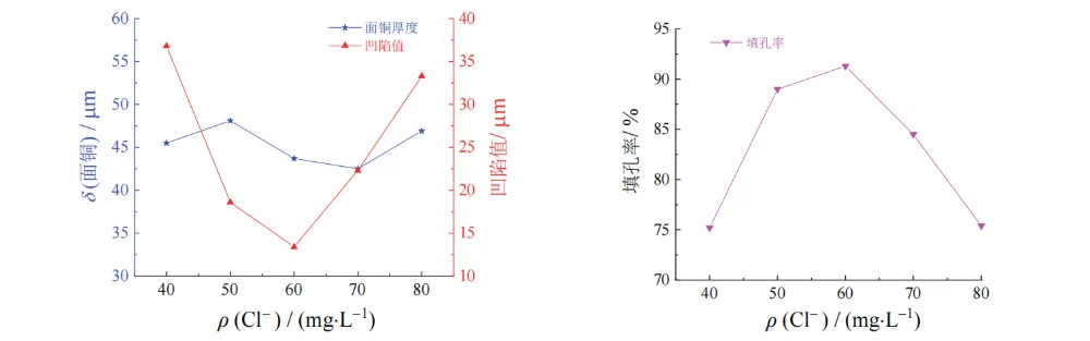 Figure 4 Effect of mass concentration of Cl鈭 on thickness of surface copper coating, dimple, and filling efficiency of through hole